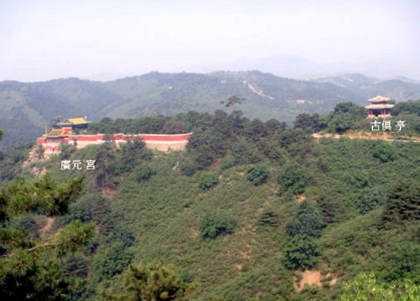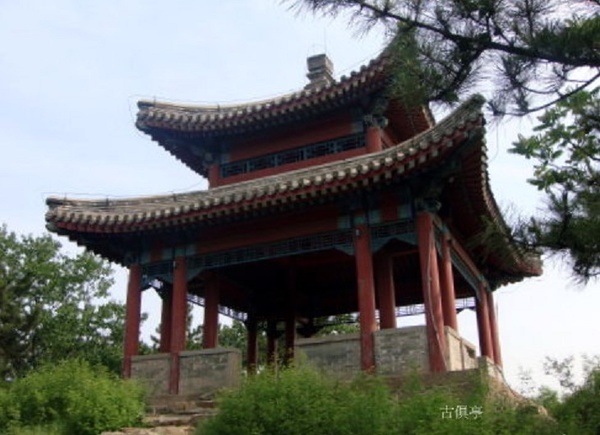 古俱亭,是一座重簷四角歇山式攢尖頂十六柱方亭,位於松雲峽北側的峰頂上,南以廣元宮為鄰,北近宮牆,此亭與廣元宮同時建造,大約在1776—1781年(乾隆四十至四十六年)完工.是皇帝祭天時休息賞景所在之處.雪後看上去更加秀麗.乾隆在《古俱亭》詩中寫道:“喬松足有千載古,峻嶺今看一笠俱.小坐逍遙得奇會,忘年之友定無殊.”意思是松、山、亭雖然有古有今,但是它們互相依存的樣子,看上去並無古今之分,亭同山與松似乎一樣古.故此,以“古俱”為此亭命名.靠近宮牆海拔520米的峰頂上.是仿東嶽泰山主峰“玉皇頂”(又名天柱峰)的意境.