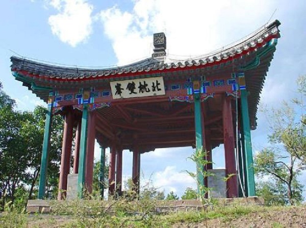 始建於康熙四十二年(1703)~四十七年,為三開間單簷攢尖頂方亭.方亭坐落的北面群山疊嶂.一個枕字,頗為傳神,即「枕」黑、金雙峰.黑’金雙峰雖距數十裡外,似枕臥此亭,得名「北枕雙峰」亭.登臨此亭向北眺望,大約距離百餘裡處,可見東西兩座高峰.西北的叫金山、東北的叫黑山,兩山遙遙相對,就像是宮殿門前兩側的望樓.