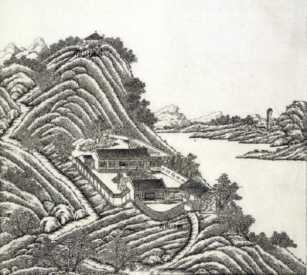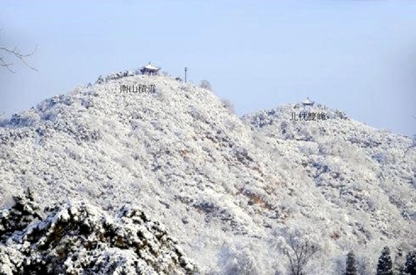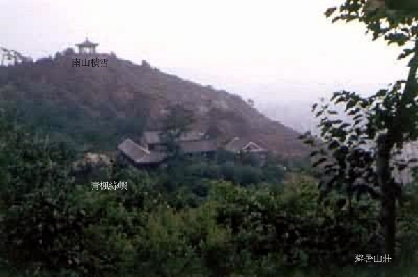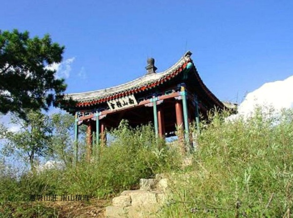 在青楓綠嶼之北的山峰有亭一座,康熙皇帝題曰「南山積雪」.方形四角攢尖式敞亭,面積較大,可一覽眾峰.「南山積雪」是觀賞山莊初冬雪景為命題的一組苑景.塞北高寒,山莊之北,峰嶺環列,嶺上積雪經久不消,直到初春時節,仍是「不改冰霜積雪冬」的景象.登亭環視,樓閣軒齋,皓潔凝素,白雪綴松,玉碧相映,遠眺,積雪皎然,玉嶺環列.康熙帝曾賦詩:「圖畫難成丘壑容,濃裝淡抹耐寒松。水心山骨依然在,不改冰霜積雪冬.