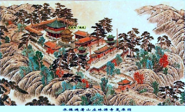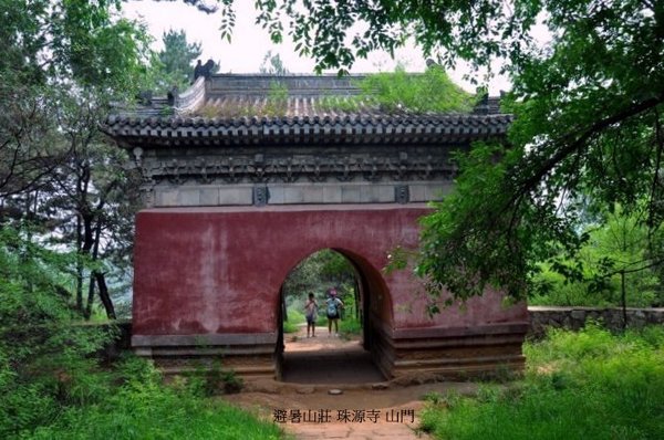 珠源寺位於西湖以西’松林峪與梨樹峪之間半山坡上,是一處大型佛寺,建於 1761年(乾隆二十六年),類同頤和園內的寶雲閣. 寺門面東,原懸掛“珠源寺”匾額.北近瀑源,山瀑珠濺,景色殊佳,故名.門殿3間,題名“定慈門”。以後順次為鐘、鼓樓、天王殿、石牌坊、宗鏡閣、重層閣亭(俗稱“大須彌山”)和飛樓十三楹的眾香樓(俗稱“小西天”)。宗鏡閣,高7.55米,寬 4.66米,是一座三間四方亭式建築,通體用青銅精鑄而成,共用銅207噸,俗稱“銅殿”。梁、柱、門、窗、屋頂、匾額、抱柱楹聯以及內供佛像全部為青銅鑄造,精雕細刻,技藝精湛.所有構件均用楔頭銜接,設計者巧妙的留了一個機關鑰匙口,用一把很神奇的鑰匙插進這個口,銅殿可以拆卸,其設計之精巧、工藝之精湛,堪稱天下一絕.可惜在1944年被日寇劫掠。現僅有銅匾“海藏持輪”和銅抱柱楹聯陳列於避暑山莊博物館珠源寺的紅色山門猶存,基址尚在.