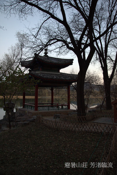 西邊如意湖亭沿湖邊林蔭道北行,湖濱的天然巨石上,有一座重檐方形亭,名"芳渚臨流"亭,建於康熙四十二年.三面臨水,巨石嵌空,或空兀於水,或橫亘於岸,石上蒼苔紫蘚,自然天成,臨流小憩,心靜神清. 光滑圓潤的山岩,系武烈河水千萬年沖刷而成.亭子四面臨水,十裡塞湖,皆倒映入清流之中;岸上樹木叢生,芳草如織.亦為「康熙三十六景」之第二十七景.