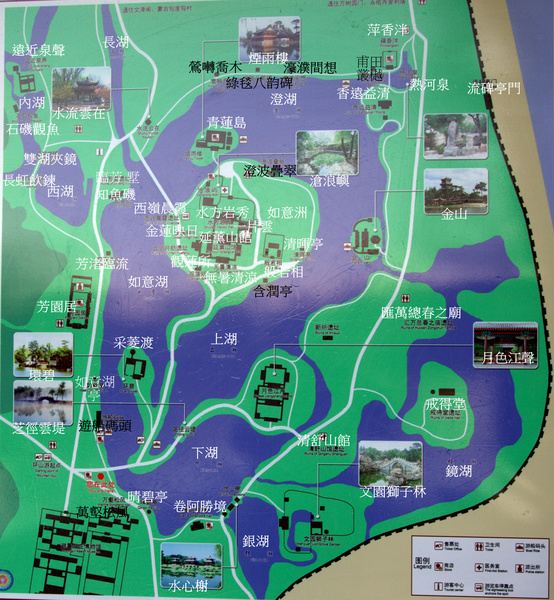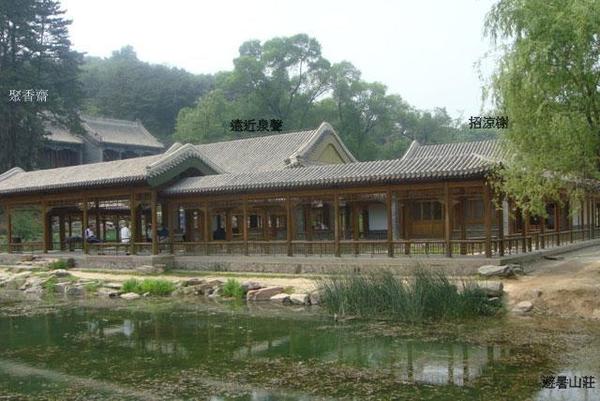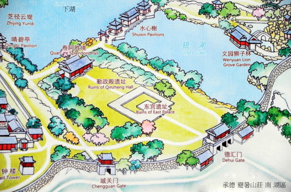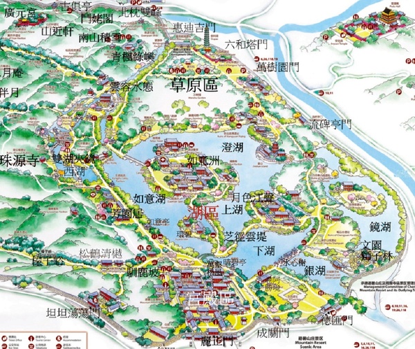 湖區;避暑山莊的湖區集中國南方園林的秀美和北方園林的雄渾,特別是把江南園林的勝景佳境移植到塞外,使它成為“來於天然,勝似江南”的獨特風格. 山莊湖泊總稱塞湖,總面積57公頃,水域和魚塘面積為28.7公頃;荷花覆蓋面積7.7公頃,湖中陸地面積16.3公頃;湖邊地面積為12.1公頃.水面分割成澄湖(現約9公頃)、長湖(已不存)、西湖(已不存)、半月湖(已不存)、如意湖(現約5公頃)、上湖(約2公頃)、下湖(約2公頃)和第二階段開闢的鏡湖(約7公頃)、銀湖(1.3公頃)等. 湖水來源一是山間溪流,二是熱河泉水,三是武烈河水。 武烈河水從北魏酈道元考察至遼金約六七百年間,沒有固定河道. 到清時期才形成固定河道. 西元1701年康熙巡視到此時,發現這裡地形複雜,有林木茂密的山巒,有幽靜深遂的峽谷,有平坦如茵草地,有婉蜒曲折的河流湖泊. 決定在此修建行宮. 首先建堅固的堤壩,將武烈河水向東推移,利用騰出的河道和天然的水用人工稍加改造即成現在湖區的雛形. 山莊內大小湖泊共八處;澄湖、鏡湖、如意湖、上湖、下湖、銀湖、半月湖、內湖. 澄湖;是最大最深的湖,位於煙雨樓以東,金山島以西,岸邊有甫田叢樾,鶯囀喬木、濠濮間想、水流雲在四亭. 澄湖與金山島互為藉景,形成山環水抱的園林效果. 上湖和下湖;位於水心榭以西,芝徑雲堤以東,南鄰宮殿區,圍成月色江聲島. 臨湖遠眺,日間,可見水心榭在水中的倒影,夜間可聆聽月色下的江水拍打岸邊形成悅耳的山莊夜曲. 如意湖;北接澄湖,南連宮殿區,西接山麓,東臨如意洲、環碧島. 此湖既可觀賞煙雨樓、如意洲與環碧島,也可臨磯觀魚. 如意洲北岸,便是乾隆觀魚的景點“知魚磯”.知魚磯在如意湖北,面向湖面,陽光透射湖底,溪水清澈. 內湖;是山莊最西邊的湖,緊貼山麓. 湖畔有湧翠巖、觀瀑亭,形成小瀑布的景觀. 特別是雙湖夾鏡內引進的敖漢蓮,花朵大,花期長; 半月湖:匯集山間的溪水,經長湖緩緩流向如意湖. 鏡湖、銀湖;是山莊東部的湖泊,主要是通過五孔閘調節山莊內水位和保障文園獅子林內水流的巡迴. 在湖區中有三個島嶼;環碧島、月色江聲島、如意洲島. 島與島之間有長堤相連. 湖區的遊覽路線有三條; 中線,是從萬壑松風下蹬道,沿芝徑雲堤北行,經環碧、如意洲達煙雨樓. 東線,是由東宮卷阿勝境殿經水心榭至月色江聲、金山、香遠益清,熱河泉,以及銀湖、鏡湖區的文園獅子林、清舒山館、戒得堂、匯萬總春之廟(花神廟)。 西線,是經正宮岫雲門,下魚麟坡、經如意亭、芳園居、芳渚臨流,可至文津閣,順林蔭道進入山區和平原區 .
