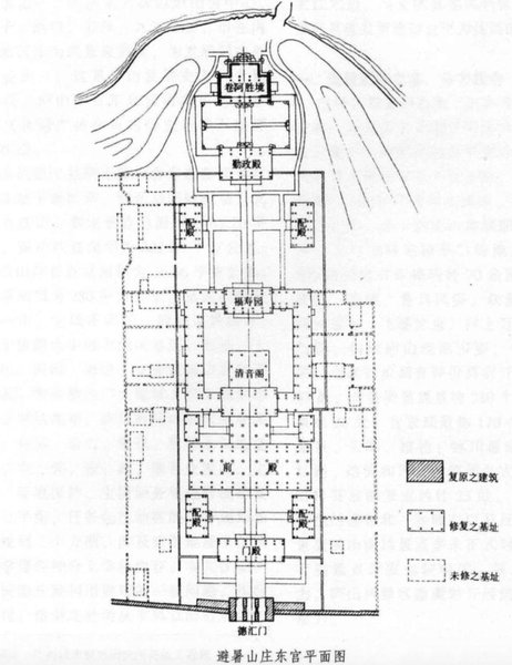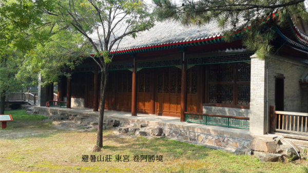 東宮是清乾隆16年,建在山莊內與正宮殿區同等作用的宮殿區.東宮從南向北中軸線上的建築依次為門殿七間、正殿(即前殿)十一間、清音閣、福壽閣、勤政殿、卷阿勝境殿。東宮東西寬90米,南北全長230米目前復建的卷阿勝境殿佇立. 東宮宮殿區最特殊的建築是清音閣.“它是清代三大戲樓之一,清音閣在福壽園內,其四周由南側的後陪閣、北側的福壽閣,東西兩側的煙月清圍成一個相對獨立的大院落。唱戲看戲均在這裡進行.” 清音閣及其附屬建築是北京故宮暢音閣的五倍多.“演戲可以分三層樓同時演唱表演,演員可近千人,裙樓看戲聽戲可容數千人.”乾隆年間在避暑山莊內舉行的重大盛典活動,均在此地進行.