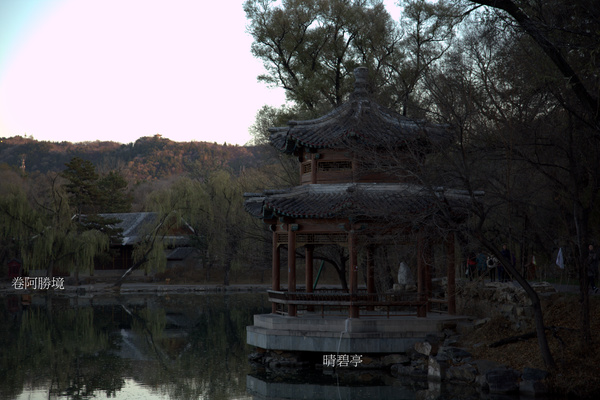 一座重簷攢尖頂八角亭. 此亭建於1708年(康熙四十七年),地處康熙三十六景之一的“萬壑松風”崗下,據《熱河志》記載:“前殿據崗背下湖,漸近湖為坡坨,殿五楹,北向.長松數百,掩映周圍,額曰:'萬壑松風'……康熙壬寅,上以沖齡(乾隆時年幼)隨侍山莊,賜居於此.殿後三楹曰'鑑始齋',坡下亭曰'晴碧'。”康熙壬寅,即是1722年,十二歲的乾隆,跟隨祖父來到避暑山莊,住在“萬壑松風”的“鑑始齋”,“晴碧亭”距離當時乾隆的住所很近。 乾隆追憶此事,並在《晴碧亭憶舊》一詩中寫道:“萬壑松風之山陰,枕溪有亭曰晴碧.我年十二隨至此,即指殿傍為賜它.望見御舟泊亭畔,呼名趨下層岩壁.顧謂勿急恐蹉跌,是即初蒙恩眷目.”此詩不僅追憶了祖父對自己的關心與愛護,還介紹了晴碧亭的具體位置.
