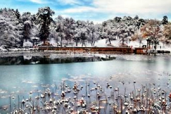 臨芳墅之西與雙湖夾鏡間有條石壘砌的堤橋,西湖之水由橋孔注入東湖. 建於康熙四十二年至四十七年(1703年-1708年),位於西湖中,為一石堤長橋橫貫南北.清澈的湖水像兩面明鏡夾著長堤,橋的兩端各有一座牌坊,南曰「長虹飲練」,北曰「雙湖夾鏡」,均為康熙皇帝所題.