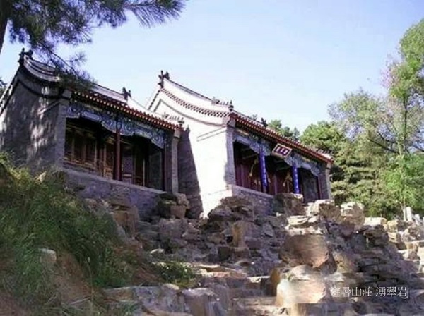 湧翠岩,建於康熙四十二年至四十七年(1703年-1708年),位於梨樹峪口南側,珠源寺東,是建在山腳石岩上的一座小型東向園林式寺院,有前殿和後樓。《熱河誌》載:“石罅泉流,出山莊西北,淙淙潺潺,下為瀑布”.前殿下有人工疊石砌成的石崖,峽峪溪水自此宣洩而下,形成飛流瀑布,噴薄於翠樹綠草叢中,景色幽美,康熙為3間前殿題額:“湧翠岩”,其後建3間二層樓,乾隆題額為“自在天”,書聯:“松徑飛花雨,蓮台靄法雲.”內供大黑天佛(據說供此神可增威德,舉事能勝).樓南有方亭一座,樓東北建值房2間.乾隆賦詩讚頌了此處之美,詩曰:“拔地青蓮聳德水,天人來往作音娛.驀逢杖錫權教住,試問眉毛拖地無?”