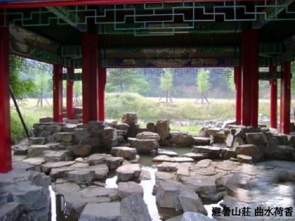 康熙三十六景之第十五景。 此景約建於1703年至1708年,方亭建在參差不齊的怪石中,其意境與曲水流觴極相似,昔日康熙、乾隆兩位皇帝曾在此宴請大臣、蒙古王公. 《熱河志》說:亭南向,在北山麓,奇石參差,麟次瓦疊. 洞水潺潺,隨石折為小沼,中植芙蕖,亭亭萬柄,翠蓋紅葩,自然香遠. 聖祖題額曰“曲水荷香”. 舊在暖溜暄波北(暖溜暄波位於避暑山莊萬樹園東北,“永佑寺”北,惠迪吉門之南,宮牆之 上起殿三楹,名“暖流暄波”),現移於文津閣南.