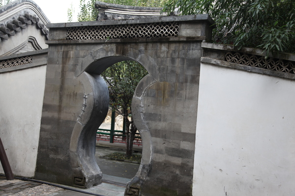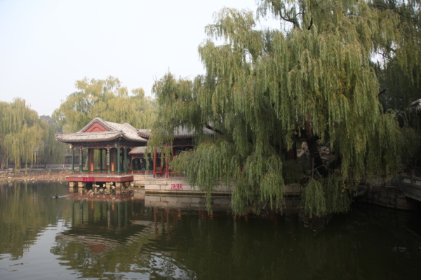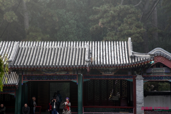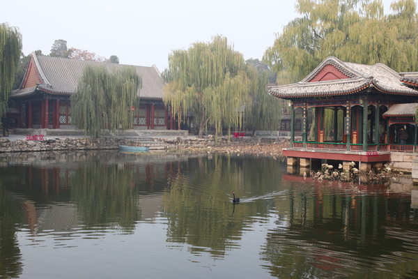 諧趣園位於頤和園的東北角,缺路標指引,洽服務人員的導覽就是由東宮門直往東北方向走,過了「紫氣東來」城關,沿著蜿蜒的小路品味芬多精,先達諧趣園宮門,再北行,東側有個吸睛的人型小門,古蹟’現代藝術?往北再走點有座宮殿(矚新樓西面),未得門入,折回藝術門試試身形考驗,過關.別有洞天的亭園,澳洲黑天鵝’錦鯉點綴秋日荷葉凋謝的湖面,秋瑟的美.