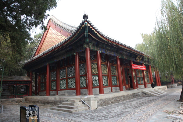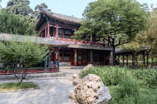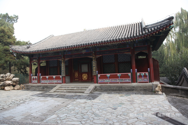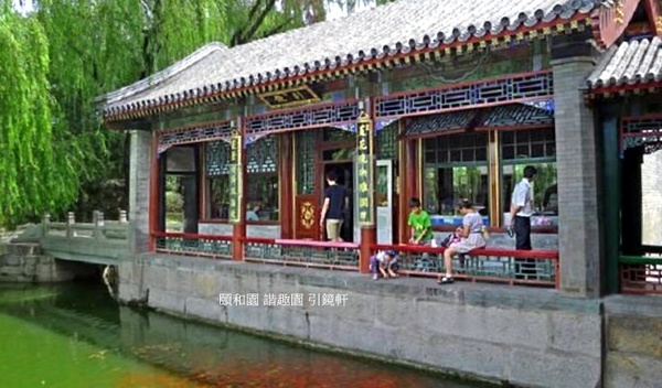 諧趣園的正殿,是嘉慶皇帝重修惠山園的時候,添建的一座面闊五間,四周出廊的歇山大殿,景台伸坐湖中,是個小碼頭. 這座殿殿體龐大臃腫,與諧趣園初建時小巧疏朗的風格相差甚遠. 涵遠堂的匾聯創作很有幾分文采,耐人品味. “西嶺煙霞生袖底,東洲雲海落樽前.”就是坐在涵遠堂內可以俯拾萬壽山夕陽凝紫的煙霞,吐納東方蒼茫無際的雲海,確實構思新穎,想像豐富.諧趣園雖小,但是小中見大,包容無限.