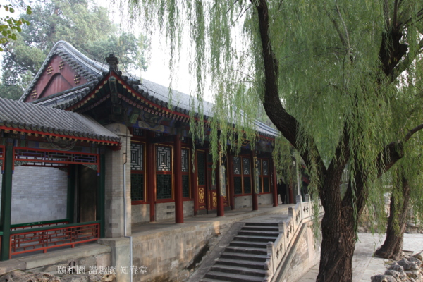 園子的最東邊,就是「知春堂」, 「知春堂」 坐東朝西,背山面水,五楹帶廊,前有月台,月台兩側均有寬敞的台階上下,台階以漢白玉護欄,鏤空雕刻,極為精緻.乾隆修清漪園時,仿無錫寄暢園的嘉樹堂修造了這座惠山園的主體建築,時稱「載時堂」.春江水暖鴨先知,盛夏荷荇開滿湖,秋啟葉枯落池園,冬雪茫茫棲湖徑.