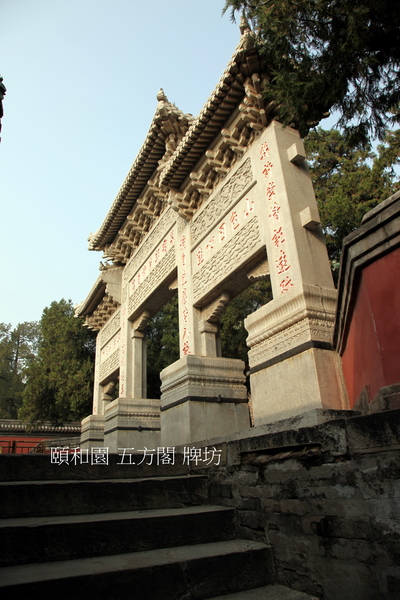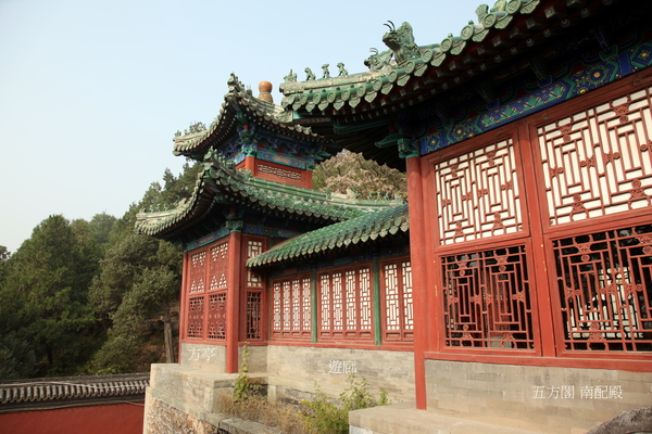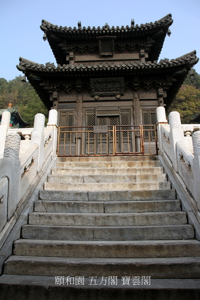 位佛香閣西南角.乾隆時期始建,與東北角轉輪藏對稱,同高.寶雲閣 銅殿為中心,由主配殿、角亭、遊廊等圍合成方形院落,其佈局象徵佛教密宗的“ 曼荼羅 ”,意喻“萬德圓滿”、眾神聚集. 1860年被焚毀,1886年重建。 “五方”表示聚五方之色,寓意天下歸心,四海昇平.五方源自佛家語“五方色-五方五佛”:東青,南赤,西白,北黑、中黃.正殿五方閣坐落在11.26米的高臺之上,閣下石壁上刻有蓮花邊框,是當年誦經時懸掛佛像的地方.兩側有三間迭落式走廊與高臺中的暗道相連.主、配殿皆為綠色琉璃瓦歇山頂.院內四角,各有一座重檐方亭,有24間迴廊連通各個殿堂.