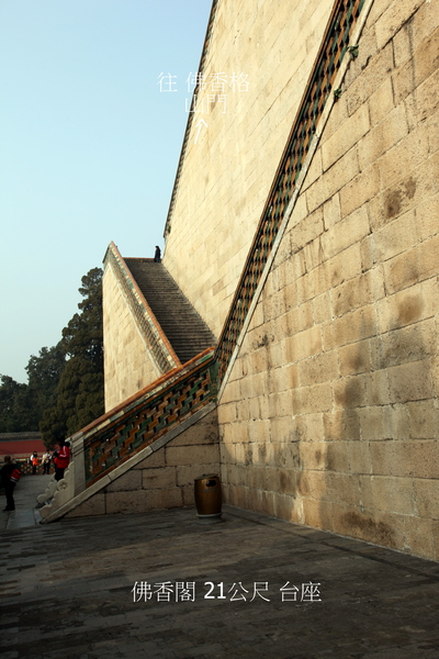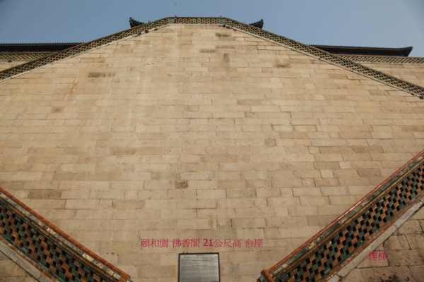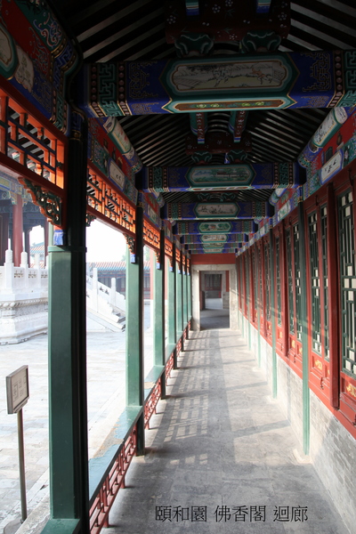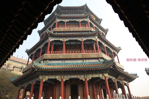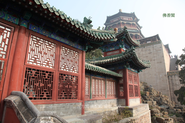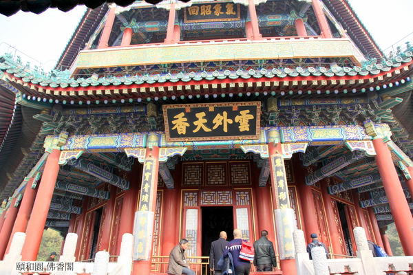 位於在萬壽山前山中央部位的山腰,“佛香”二字源於佛教對佛的歌頌.建築在一個高21米的方形台基上,是一座八面三層四重簷的建築;閣高41米,閣內有8根巨大鐵力木擎天柱(木質堅硬的一種樹,是雲南特有的珍貴闊葉樹種.它屬於金絲桃科鐵力木屬,常綠喬木,高30米,樹幹端直,樹冠塔形.),結構複雜,為古典建築精品.始建於乾隆年間,咸豐十年(1860年)被英法聯軍燒毀後,光緒十七年(1891年)花了78萬兩銀子重建,光緒二十年(1894年)竣工,是頤和園裡最大的工程.閣內供奉著“接引佛”(即阿彌陀佛,戰亂時毀壞.),供皇室在此燒香.