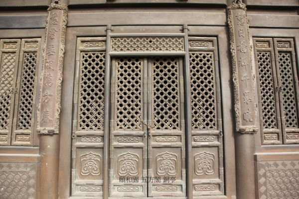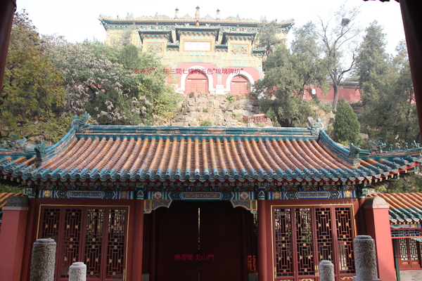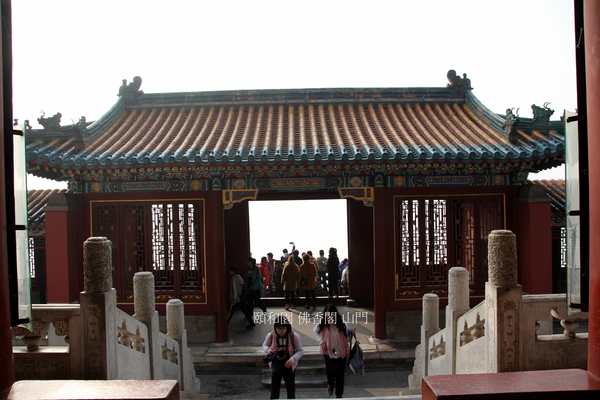 佛香閣南’北面的“門”,也稱為“山門”.佛教自東漢明帝永平十年(西元67年)傳入中國後,因佛寺多在山間,故稱山門.北京頤和園萬壽山的主體建築——“佛香閣”前面,後面的“門”,亦不例外,亦沿襲名曰為“山門”,南北山門間設迴廊. 據說,此塔初建時仿浙江之“六和塔”,建造到第八層時,因有人提出京師西北隅不宜建塔,所以拆塔改建為八角三層四重簷的“閣”.