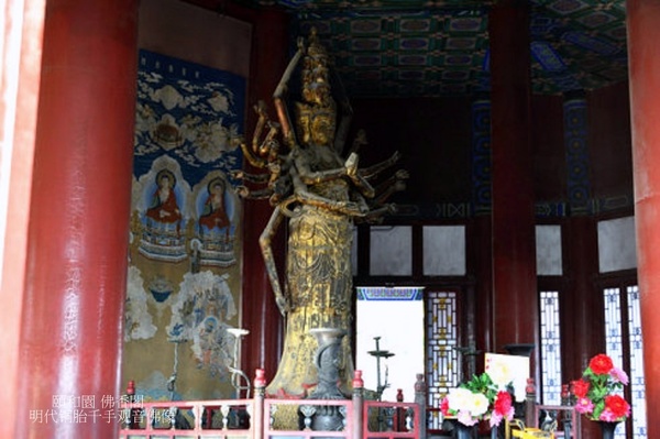 佛香閣一層供奉有一尊「南無大悲觀世音菩薩」像(銅鑄貼金的千手觀音造像),為明朝萬曆二年(1574年)所鑄,高5米,重5噸,銅胎鎏金.該像原來供奉在北京城內後海北岸建於明代嘉靖年間的彌陀寺,文化大革命期間,教師陳長庚等人冒著危險將該像完好保存下來.1988年,經協調,頤和園300多位職工徒手將該像自萬壽彌陀寺大悲殿內遷移出來,安放在佛香閣內.