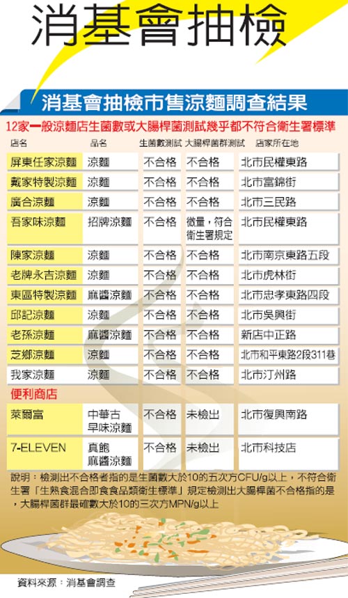 涼麵製作過程常容易被微生物污染,再加上麵裡的小黃瓜配料更容易在高溫下腐壞,為了維護消費者食的安全,今年5月底消基會再度針對市面上傳統涼麵店及便利商店推出的涼麵共16件產品,進行過氧化氫、硼酸及其鹽類、生菌數、大腸桿菌群等四項檢驗,消基會今早公布結果,消基會秘書長吳家誠表示,傳統涼麵店的涼麵,其中生菌數和大腸桿菌數含量百分百都超標,便利商店的涼麵也有兩家不合格,這種情況一年比一年惡化,顯示業者根本沒明顯改善,主管單位應該加強稽查、加重罰則,不合格的食品更應該立即銷毀。