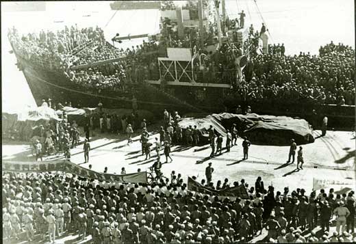反攻大陸「國光計畫」在大陸解禁,中共允許鳳凰電視台製作專題報導。圖為一九四九年古寧頭戰役大捷國軍凱旋返台,民眾在碼頭列隊歡迎。
