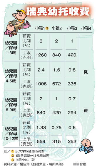 總之,她形容:「就算是瑞典最有錢的家庭,若生三個小孩,一個月幼托費用只要兩千兩百廿六克朗,約新台幣一萬元就夠了。」