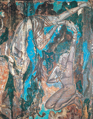 薩埵那雙手合十,縱身向下跳,他的姿態像今日跳水台上的選手,少年的身體赤裸,手臂上有手鐲,原來肉身的粉紅,年代久遠,變成暗赭色,輪廓的線條也氧化成粗黑,好像這身體要在空中經歷時間劫難,斑剝漫漶,一點一點消逝泯滅,然而在終歸夢幻泡影之前,還有最後的堅持,停格成牆壁上一片不肯消失的痕跡。