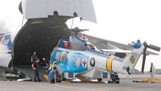 三架救護新血,由空運承商以AN-124型安托諾夫貨機從法國馬賽空運來台,經過兩天航程,昨天中午抵達空軍嘉義基地。巨大的貨機比一般小型小民航機大上三倍,台、法人員從上掀開啟的機首中,小心運出直升機機身、零件,由貨車、板車載送至基地內組裝。
