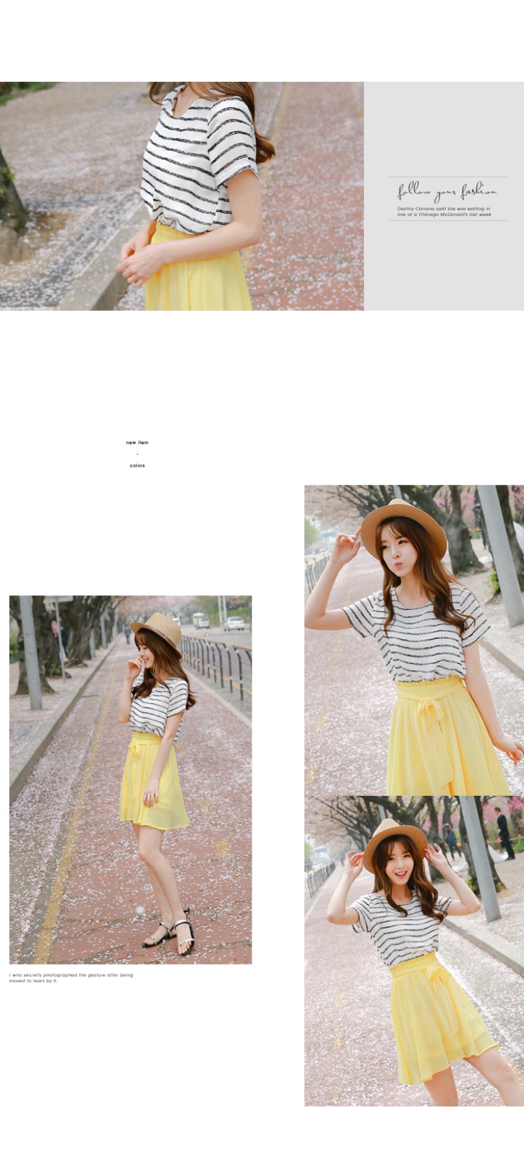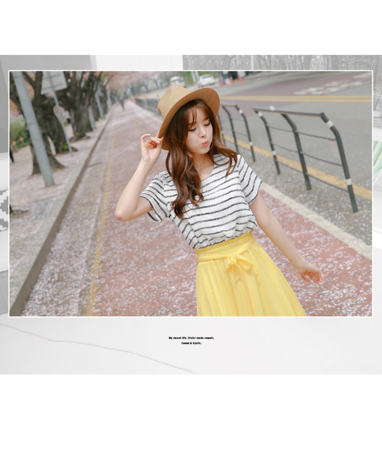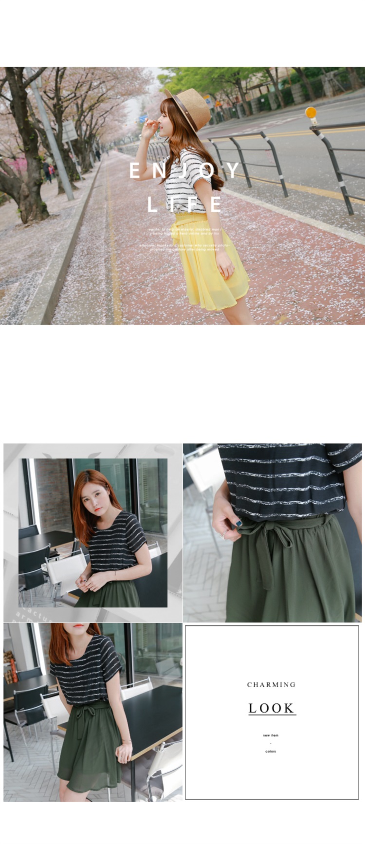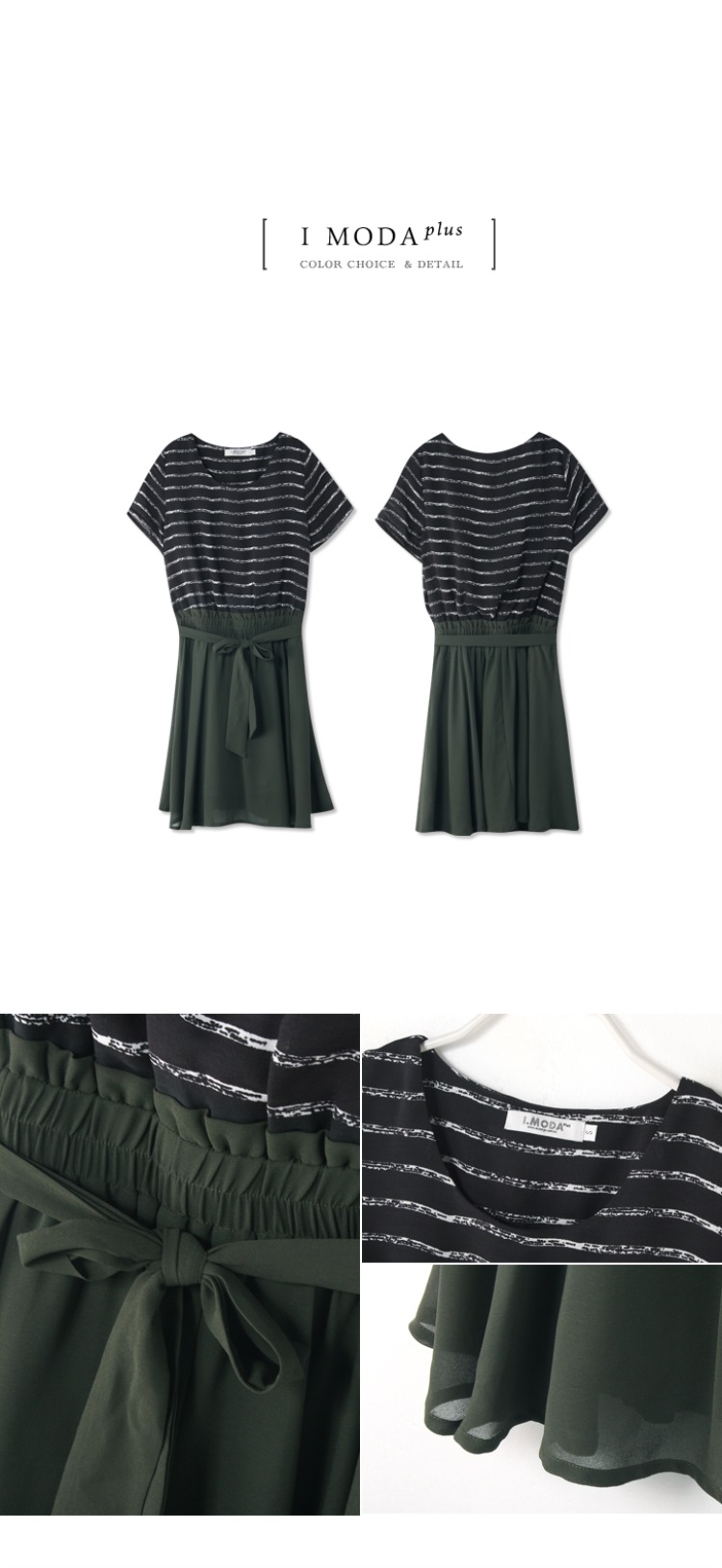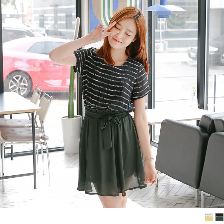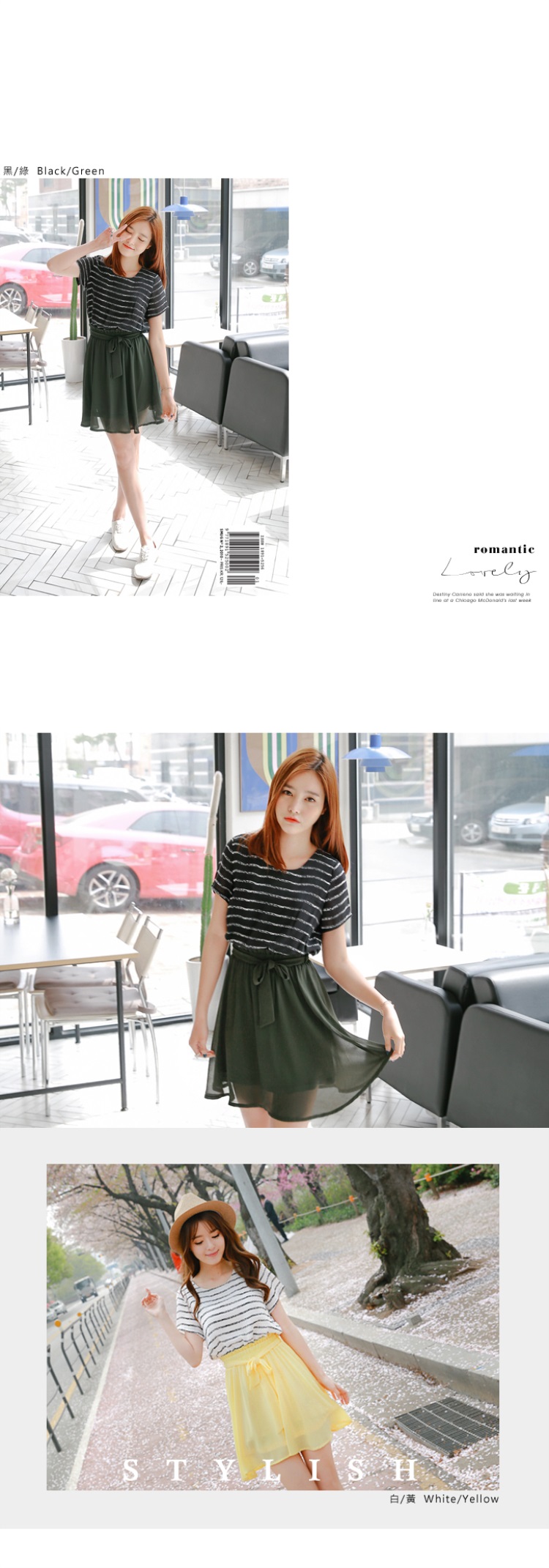 0601新品 雪紡條紋x傘襬裙腰鬆緊綁帶圓領洋裝.2色