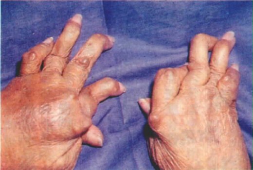 走了幾歩之後, 覺得她有點辛苦, 矮小又推著車還被罰錢, 決定回去找她, 心想快快買了就去辦正經事. 她很高興地介紹 2種梨子還有又紅又大的柿子. 趕快拿了一包梨子就問她多少錢, "200圓!" 什麼? 才四顆要價 200圓? 怎麼那麼貴? 她說颱風剛過, 家在宜蘭狀況不好, 才會搭火車來台北賣水果. 請我幫幫忙~ 低頭算錢給她, 心想: 好人做到底囉~ 突然看見她的手指捲曲無法伸直, 認出是"類風濕性關節炎" (圖示). 十分鐘後我走到明曜百貨前面, 的確看見警察在抓攤販!