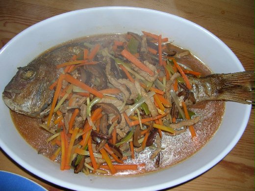 五柳香醋魚 - 香菇絲, 肉絲, 蔥絲, 薑絲, 紅蘿蔔絲. 魚煎好備用, 炒五柳加烏醋, 鹽少許勾欠少許, 淋上已煎好的魚.