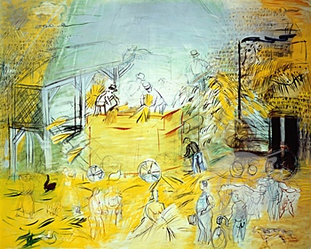 Raoul Dufy 杜菲(1887~1953)也是野獸派一族, 但是線條比較柔和; Dufy 此次有頗多畫作展出, 包括: 紅色小提琴, 打穀 等等. 下面這張圖片即是"打榖", 整幅畫充滿金黃色的豐收氣象, 農人們活躍地忙著收成, 全體呈現動態地流轉在整幅畫中; 兒時曾數次在鄉下度過暑假, 知道接下來要曬榖 去殼... 農民整年的辛勞就有了收穫. 這張"打榖"恰如其份地描繪出中外皆同的喜慶豐收.