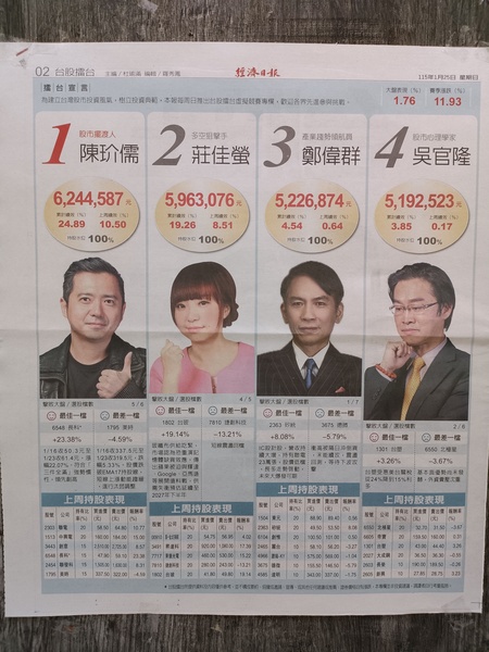 經濟日報台股擂台賽上週績效排行榜(115.01.25)