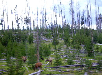 黃石公園於1988年發生天然大火,毀掉了1/3的林地,共出動了10萬個救火員,還是無法撲滅森林大火,直到天降甘霖,撲滅了這場大火,這就是自然平衡法則。望著巴士外,新長出來的杉木與已燒毀的白色枯幹(有的倒地不起),形成一種不協調的自然景象,正如同我的心情一般,心力交瘁與奮力一搏…,也或許老天正要我思考,欲火重生的力量。
