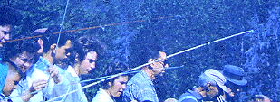 「黃石湖」-- 許多河流小溪的源頭。黃石湖海拔7,733英呎,水深約400英呎,湖岸長達180公里,是北美洲最大的高山湖。釣魚橋(Fishing Bridge):顧名思義這座橋是用來釣魚的。1931建造完成(也算年份久遠的一座橋了,照片中可以看到木樁)。在1973年以前,是遠近馳名的釣魚場所。當時這裡真的是盛況空前,由於橋樑恰巧位在黃石河與黃石湖的交界處,所以魚群非常多(我想應該是鱒魚很好吃吧!)。 比肩繼踵的釣客,將這座橋擠的水洩不通。後這裡爲什麼被禁止釣魚了(Off the Hook),當然是破壞自然生態,鱒魚數目持續下降。經過了這幾十年的保護,高山白魚和紅鰓鱒開始回到這裡產卵,恢復當年的生命力。當我們一整台巴士的人,被放下車之後,靜謐的湖泊,又被我們這些遊客破壞了…。