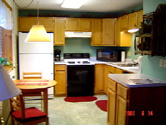 廚房跟我們一般住家廚房沒什麼兩樣。煮飯用的電爐加烤箱(比我們家用的還要先進)、洗碗機、大台的電冰箱及一台也是大的微波爐。Wow! 感覺比我們現在住的房子還要闊氣。廚櫃內,碗盤十來個(乾淨、美觀),全是微波爐可用的器具。刀、叉、湯匙,也是好幾組收藏在抽屜內(數量比我們家還多)。水果盤、桿麵棒、一組茶匙、洗碗精、菜瓜布、抹布、桌墊、鍋子無數個…,這這...根本可以直接住在這裡了嘛! 有些煮飯用的傢伙,我們家廚房還找不到ㄋㄟ。有備感禮遇的感覺。