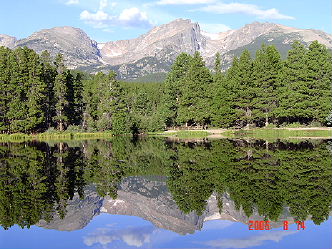 在大約13000到15000年前的冰河時期,你可以想像500英尺厚度的冰層慢慢往下移動,漸漸切割出目前所看到的層立山峰嗎? 其中Hallett Peak與 Fallttop Mountain形成明顯的一個U字型山谷,是冰河活動時期所留下的。也是目前在熊湖區大大小小的湖泊,所見的主要背景,沿著步道一直向上爬升,Hallett Peak與 Fallttop Mountain被冰蹟刻畫出的遺跡就越清楚。為了眼前的壯麗景觀,怎麼樣都得用力呼吸,奮力向上走。事實上我已將專注力維繫在控制身體平衡,不知怎麼的,身體有著說不上來的奇怪! 到了夢湖(真的不是夢),根本已經進入仙境,難怪總覺得身體有飄飄欲仙的感覺,不過最後還是被強風,催促著我們向前推進到最後一座高山湖,也是最接近Hallett Peak與 Fallttop Mountain的源頭, Emerald Lake(翡翠湖)幾乎就在兩座山峰下。我們倆不論用什麼姿勢或是攀上較危險的角度,都無法將山峰與湖面的自然景觀,放進相機框框裡。最後電池耗盡,只好帶著記憶打道回府。原本計畫再到Haiyaha Lake ,但距離太遠最後還是放棄。高山上的1 Mile路程,好似走在平地的3哩遠。第二天的Longs peak 及Chasm Lake 將會是體力大考驗。