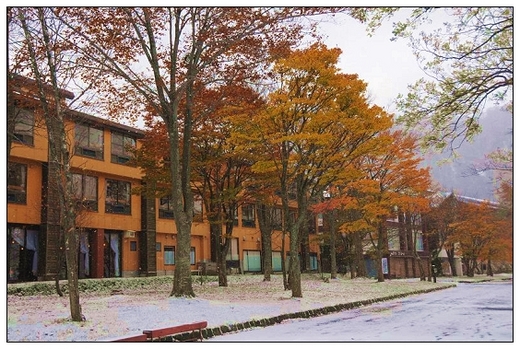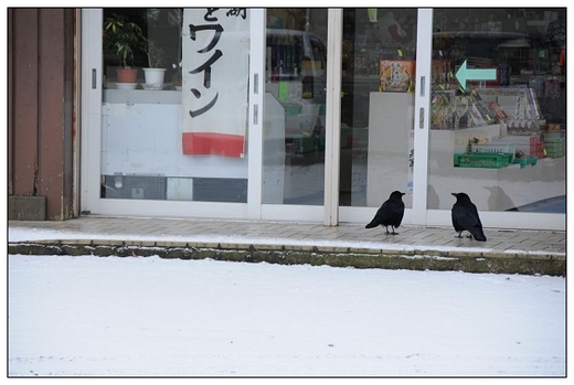第二天早起,掀開窗簾,不得了!迷濛中,地上一片白,是雪耶!它已經下了一晚!吃過豐盛的自助早餐,趕快拿出像機,追雪去!沿著「十和田莊」旅館外通往十和田湖畔的馬路走去,只見一片「粉妝玉琢」的冰雪世界,配上紅、黃、綠的樹葉,枯枝、老樹、昏鴉(日本的烏鴉很肥碩,正在居酒屋前徘徊,太冷了等酒喝嗎?),清冷的馬路,只有偶爾來往的車輛,別有一番神秘情境。濛濛細雪鎖住十和田湖,兩艘游湖船隻靜靜的停在湖岸,今早游湖應該也什麼都看不見吧!