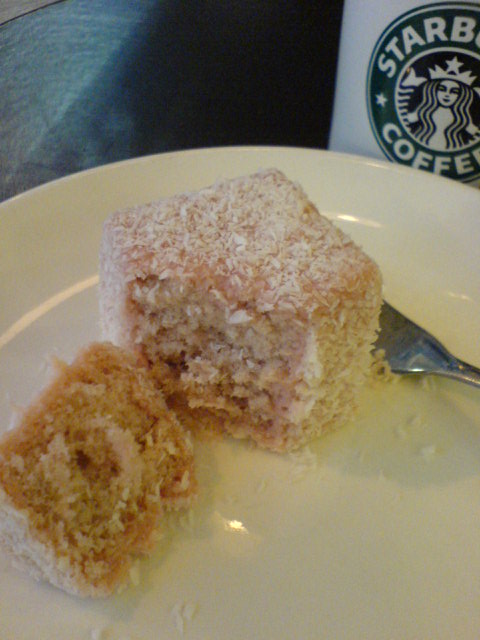 又然後,我終於在趕緊完成了大部分工作時,可以走進星巴克享受了一杯咖啡,(雖然這裡的咖啡並非我的最愛)我就看到那新口味lamington靜靜地在盤子裡待著我的出現,我點了士多啤梨口味,還好!