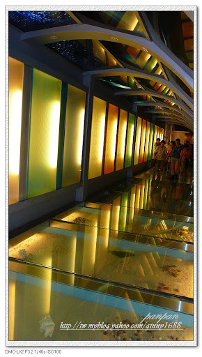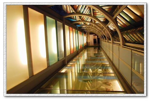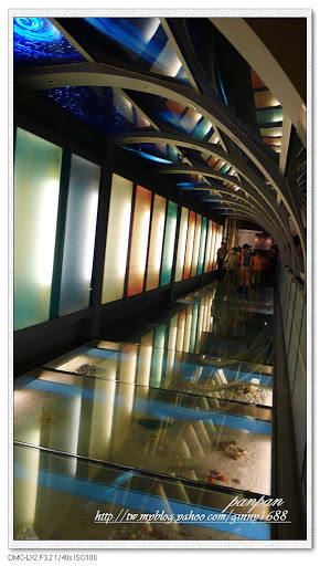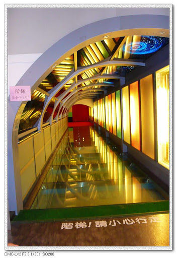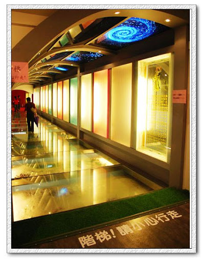 直上二樓後,一個玻璃做成的時光走廊出現眼前,地板是透明的玻璃,踏上去真怕把它踩破,後來求證地面以3塊8mm厚度強化玻璃膠合而成,可承重1000公斤,所以別擔心