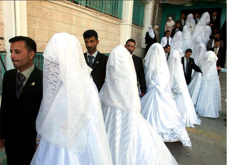 約旦首都安曼二十日由伊斯蘭教的慈善團體舉辦一場集體婚禮,共有三十二對新人參加。圖為集體婚禮的情形,由於伊斯蘭教的習俗,使得新娘即使穿白紗也全身包得緊緊不露出長相。(歐新社)