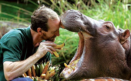 德國柏林動物園員工弗雷茲曼十七日以園內種植的香蕉餵食河馬「葛雷戈」,圖為葛雷戈張大嘴巴,好像想把弗雷茲給吞了,相當可愛、有趣。(美聯社)