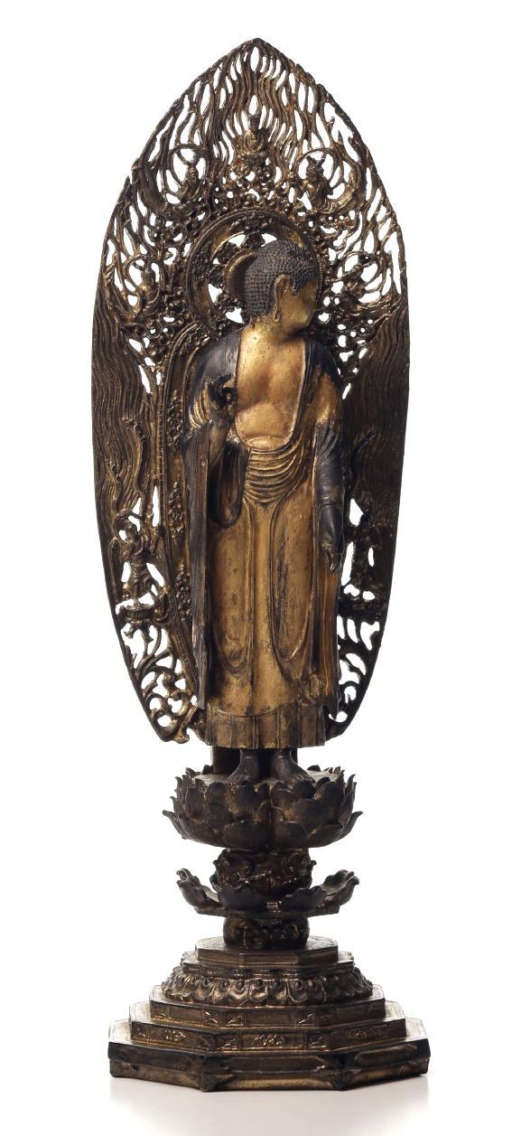 身著袒胸袈裟,左手垂下結印,右手上舉結印,此為下品上生接引印。佛衣輕柔貼體,自然流暢,赤足立於七層蓮花月輪之上。背光雕刻的十分精美細膩,下方二側各有一護法,火焰紋向上至頭部,上方二側各有二位飛天,整個背光似升騰的火焰,極具美感。正中頂部有一尊禪定坐佛像。