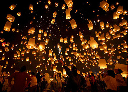 泰國清邁二十四日歡慶水燈節,希望藉由施放水燈來向水神祈福,並將壞運一起帶走。這項泰北傳統已經有七百多年歷史,每年泰曆十二月的月圓之夜,民眾全家大小都會到河邊放水燈、天燈、煙火。圖為泰國民眾齊聚放天燈,上千盞的天燈將夜色點綴得十分美麗。(歐新社)