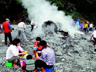 「可以煮了!」遊客搬來整箱雞蛋,一大袋玉米,丟到地熱水裡煮;還有遊客連螃蟹也帶來煮。遊客回應說:「好吃,雞蛋好嫩哦!」