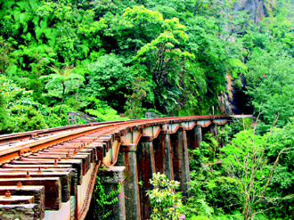 台鐵平溪線三貂嶺與大華站間的幼坑鐵橋,是台灣少見的鋼梁鐵橋,魚腹型橋身與周遭蒼翠山谷融為一體,是平溪線上最動人的一景;台鐵最近在橋身旁施工搭建步道,鐵道專家直搖頭,「幾近毀容,看了會吐血!」