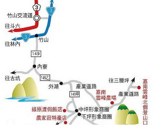 ★嘉南雲峰農場、嘉南雲峰北側登山口:國道3號下竹山交流道接台3線再轉149縣道,接149乙、149甲循石壁風景區景指標行依續可達。