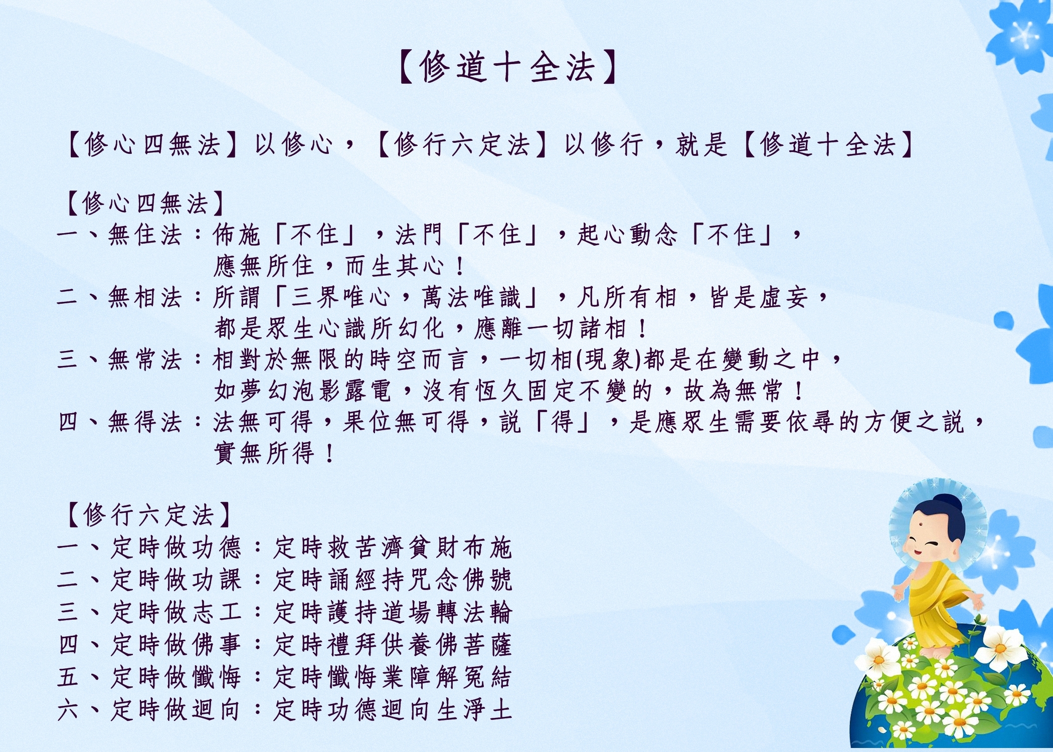【修心四無法】,再配合【修行六定法】,就是【修道十全法】