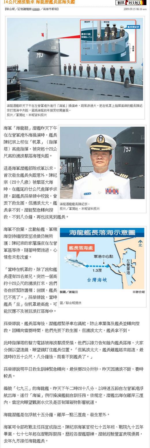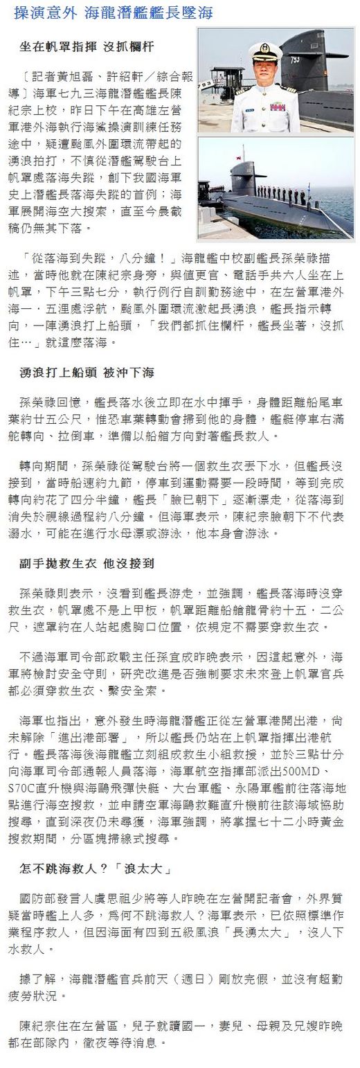 海軍潛艦海龍號艦長陳紀宗14日不慎落海,海軍曾江艦今天上午在左營軍港外海西南方3.1浬處尋獲陳紀宗遺體,隨即送往海軍醫院,軍方以隆重軍禮迎靈,家屬哀傷欲絕。
