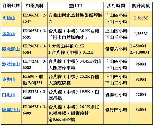 谷關七雄,台8線往谷關方向坐落於大甲溪兩旁,依照標高排列,分別是八仙山、馬崙山、屋我尾山、波津加山、東卯山、白毛山、及唐麻丹山,屬於中級山,最短路程3小時可來回,最長最困難者9小時也可來回,是相當適合當天往返的爬山健行活動。