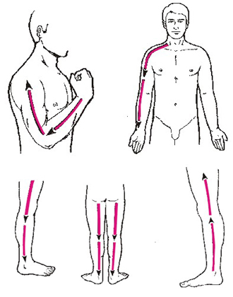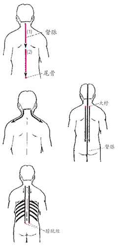 | 正確的刮痧手法與順序 刮痧操作之順序依身體狀況而定,先刮後頸部,次刮背部,再刮胸部,末刮四肢,此為一般的原則。基本刮痧方向,依經絡循行「陰升陽降 」之原則,至於刮痧手法,分別敘述於各部位刮痧內。