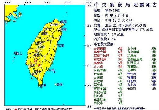 高雄甲仙上午8時18分發生規模芮氏6.4強震,震央在高雄甲仙東南方17公里處,地震深度只有5公里,是一起淺層地震。這起地震是高雄百多年來最大的地震,未來兩周內都可能出現較大的餘震。