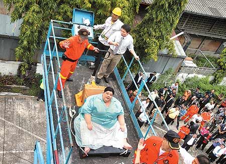 泰國曼谷市政府26日出動推高機等各式機具和器械,協助體重達274公斤的婦女烏努雅蓬.東普拉派Umnuayporn Tongprapai)從自家3樓公寓離開,坐上救護車就醫,準備動手術切除右腿的一個腫瘤。烏努雅蓬現年40歲,據信是泰國最胖的人,此番係她3年來首度離家。(美聯社)