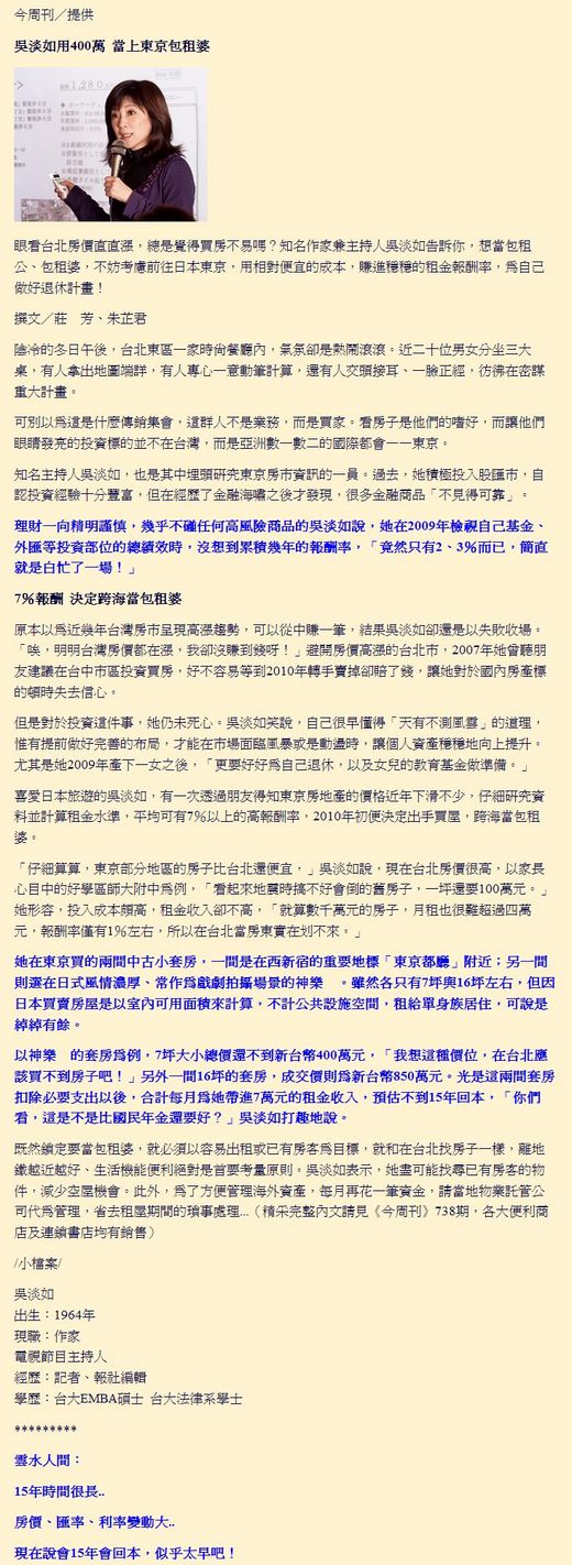 吳淡如用台幣1250萬 當上東京包租婆