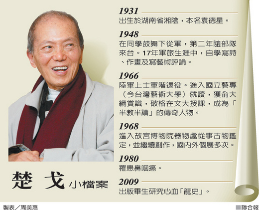 集藝術家、詩人、藝評、藝術研究者於一身的楚戈,在與鼻咽癌搏鬥卅載後,一日下午五時廿三分病逝於台北榮總,享年八十歲。